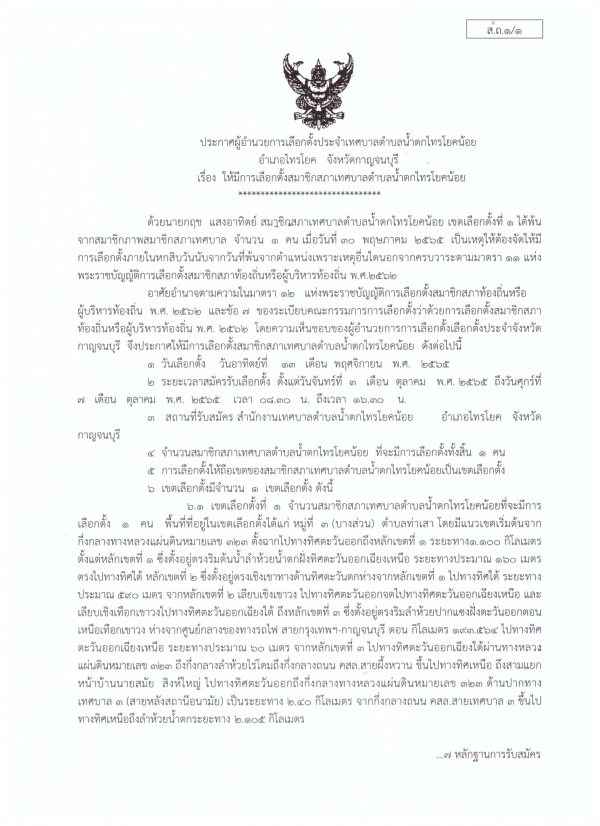 ประกาศให้มีการเลือกตั้งสมาชิกสภาเทศบาลตำบลน้ำตกไทรโยคน้อย เขตเลือกตั้งที่ 1 แทนตำแหน่งที่ว่าง