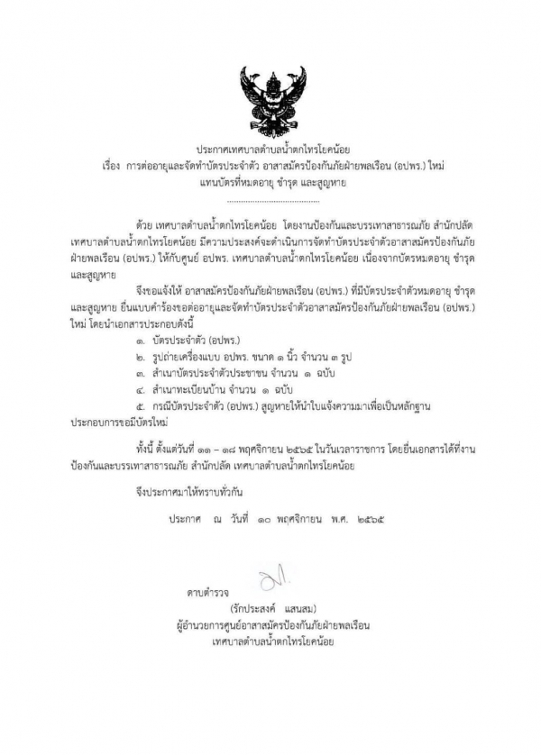 หากท่านใดมีความประสงค์จะต่อบัตรใหม่ สามารถแจ้งความประสงค์ได้ที่งานป้องกันและบรรเทาสาธารณภัย สำนักปลัด เทศบาลตำบลน้ำตกไทรโยคน้อย ตั้งแต่บัดนี้ จนถึงวันที่ 18 พฤศจิกายน 2565 ในเวลาราชการ