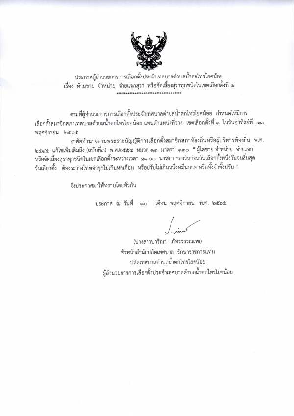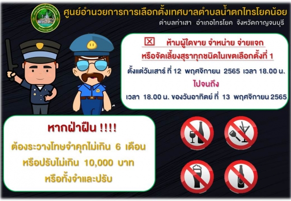 "ห้ามผู้ใดขาย จำหน่าย จ่ายแจก หรือจัดเลี้ยงสุราทุกชนิดในวันเลือกตั้งสมาชิกสภาเทศบาลตำบลน้ำตกไทรโยคน้อย