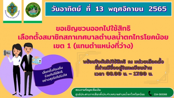 เทศบาลตำบลน้ำตกไทรโยคน้อย ขอเชิญชวนพี่น้องประชาชน ร่วมออกไปใช้สิทธิ เลือกตั้งสมาชิกสภาเทศบาลตำบลน้ำตกไทรโยคน้อย เขตเลือกตั้งที่ 1 แทนตำแหน่งที่ว่าง ในวันอาทิตย์ ที่ 13 พฤศจิกายน 2565 ตั้งแต่เวลา 08:00-17.00 น. ณ หน่วยเลือกตั้งที่ท่านมีชื่ออยู่ในทะเบียนบ้าน