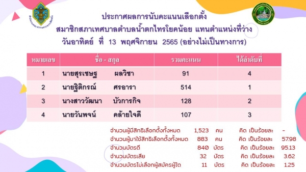 ผลการนับคะแนน การเลือกตั้งสมาชิกสภาเทศบาลตำบลน้ำตกไทรโยคน้อย เขตเลือกตั้งที่ 1 แทนตำแหน่งที่ว่าง (อย่างไม่เป็นทางการ) วันอาทิตย์ ที่ 13 พฤศจิกายน 2565