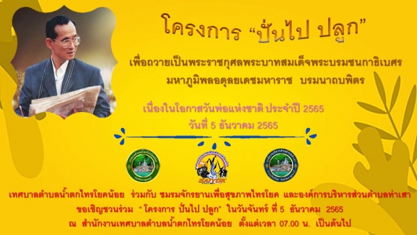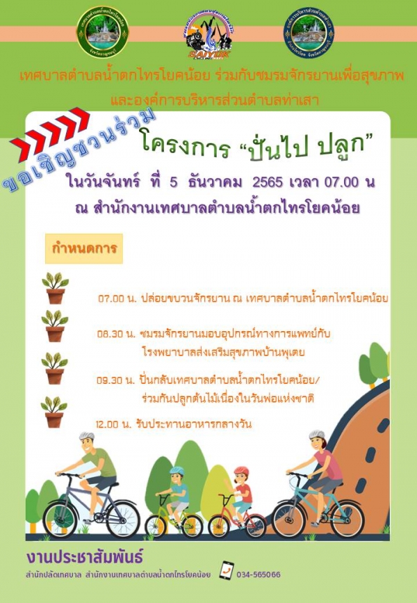 เทศบาลตำบลน้ำตกไทรโยคน้อย ร่วมกับชมรมจักรยานไทรโยค และองค์การบริหารส่วนตำบลท่าเสา ขอเชิญชวนร่วมกิจกรรม "ปั่นไป ปลูก และปั่นปันบุญ" เนื่องในโอกาสวันพ่อแห่งชาติ 5 ธันวาคม 2565 เพื่อถวายเป็นพระราชกุศลพระบาทสมเด็จพระบรมชนกาธิเบศร มหาภูมิพลอดุลยเดชมหาราช บรมนาถบพิตร ในวันจันทร์ ที่ 5 ธันวาคม 2565 ตั้งแต่เวลา 07.00 น. เป้นต้นไป ณ บริเวณสำนักงานเทศบาลตำบลน้ำตกไทรโยคน้อย