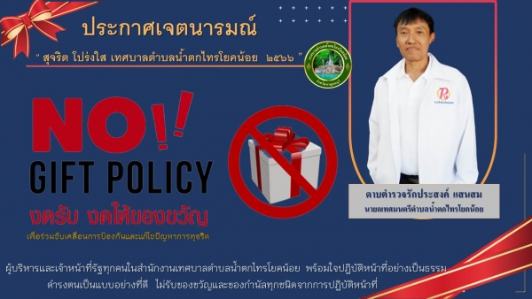ข้าพเจ้า ดาบตำรวจ รักประสงค์ แสนสม นายกเทศมนตรีตำบลน้ำตกไทรโยคน้อย ขอประกาศว่า เทศบาลตำบลน้ำตกไทรโยคน้อยเป็นหน่วยงานที่เจ้าหน้าที่รัฐทุกคนไม่รับของขวัญและของกำนัลทุกชนิดจากการปฏิบัติหน้าที่ และขอแสดงเจตนารมณ์ว่า จะทำหน้าที่นำบุคลากรเทศบาลตำบลน้ำตกไทรโยคน้อย ให้ยึดมั่นในสถาบันหลักของประเทศ อันได้แก่ ชาติ ศาสนา พระมหากษัตริย์ และการปกครองระบอบประชาธิปไตยอันมีพระมหากษัตริย์ทรงเป็นประมุขจะประพฤติปฏิบัติตนในสัมมาอาชีพ ดำรงตนเป็นแบบอย่างที่ดี กล้ายืนหยัดในสิ่งที่ถูกต้อง คิดถึงประโยชน์ส่วนรวมมากกว่าประโยชน์ส่วนตัว พร้อมปฏิบัติหน้าที่อย่างเป็นธรรม ด้วยความซื่อสัตย์ สุจริต โปร่งใสยึดมั่นคุณธรรม จริยธรรม