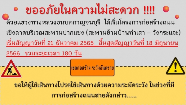 จึงแจ้งประชาสัมพันธ์ผู้ใช้เส้นทางโปรดใช้เส้นทางด้วยความระมัดระวัง ในช่วงที่มีการก่อสร้างถนนสายดังกล่าว....