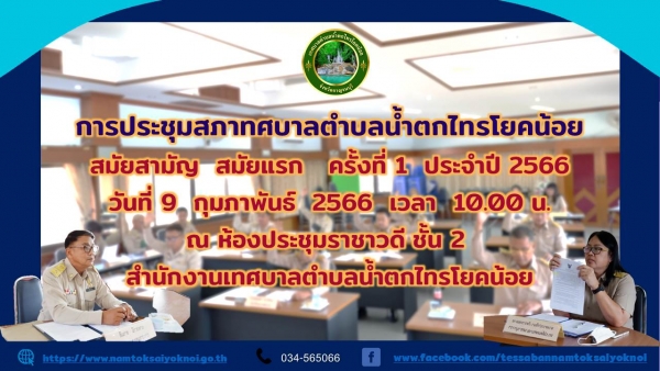 วันพฤหัสบดี ที่ 9 กุมภาพันธ์ 2566 เวลา 10.00 น. นายธานี สามสี ประธานสภาเทศบาลน้ำตกไทรโยคน้อย เป็นประธานในการประชุมสภาเทศบาล สมัยสามัญ สมัยแรก ครั้งที่1 ประจำปี พ.ศ. 2566 ณ ห้องประชุมราชาวดี ชั้น 2 สำนักงานเทศบาลตำบลน้ำตกไทรโยคน้อย