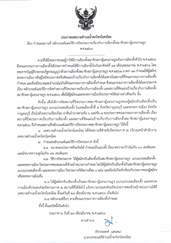 กำหนดสถานที่ หลักเกณฑ์และวิธีการปิดประกาศเกี่ยวกับการเลือกตั้งสมาชิกสภาผู้แทนราษฎร พ.ศ. 2566