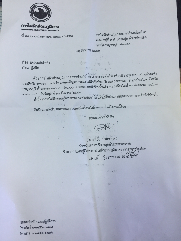 การไฟฟ้าส่วนภูมิภาคสาขาไทรโยคแจ้งดับไฟ