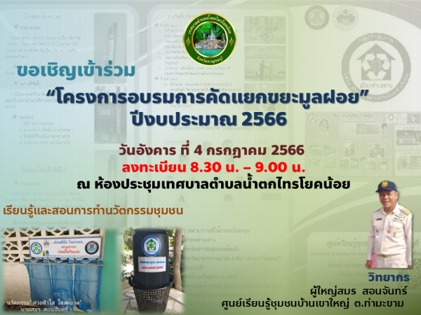 วันที่ 4 กรกฎาคม 2566 เทศบาลตำบลน้ำตกไทรโยคน้อย ดำเนินโครงการอบรมการคัดแยกขยะมูลฝอย ปีงบประมาณ 2566 วัตถุประสงค์ของโครงการ
