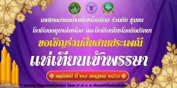 ขอเชิญชวนร่วมงานแห่เทียนเข้าพรรษา ประจำปี 2566 เพื่อสืบสานประเพณีแห่เทียนพรรษา ในวันพฤหัสบดี ที่ 27 กรกฎาคม พ.ศ. 2566 จึงขอเชิญผู้สนใจเข้าร่วมขบวนแห่ พร้อมกัน ในเวลา 7.30 น. ณ บริเวณลานหน้าน้ำตกไทรโยคน้อย