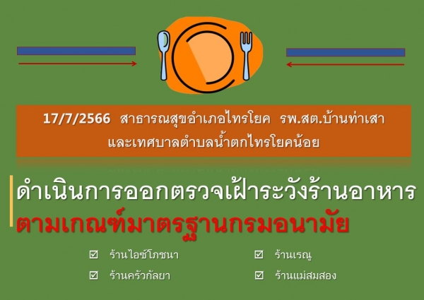 วันที่ 17 ก.ค.66 สาธารณสุขอำเภอไทรโยค รพ.สต.บ้านท่าเสา และ เทศบาลตำบลน้ำตกไทรโยคน้อย ร่วมดำเนินการเฝ้าระวังร้านอาหารตามเกณฑ์มาตรฐานกรมอนามัย เพื่อรองรับนักกีฬาและประชาชนที่เดินทางเข้ามาในพื้นที่เขตเทศบาลตำบลน้ำตกไทรโยคน้อย ต.ท่าเสา อ.ไทรโยค จ.กาญจนบุรี เพื่อร่วมงานกีฬาแห่งชาติ "กาญจนบุรีเกมส์" ณ