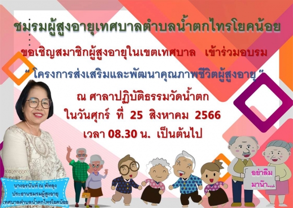 ขอเชิญสมาชิกผู้สูงอายุในเขตเทศบาลตำบลน้ำตกไทรโยคน้อย เข้าร่วมอบรม "โครงการส่งเสริมและพัฒนาคุณภาพชีวิตผู้สูงอายุ"