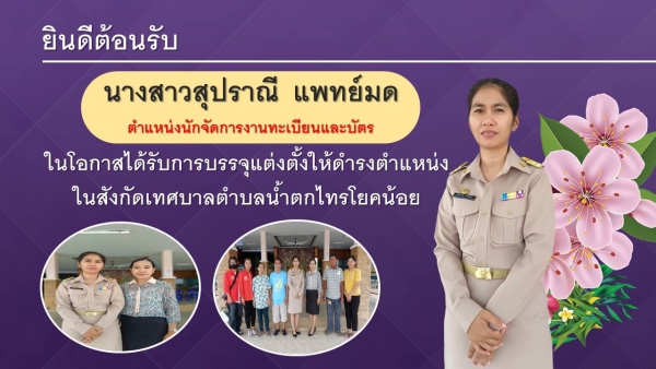 วันที่ 1 กันยายน 2566 นางสาวนิภาภัทร เงินถาวร ปลัดเทศบาลตำบลน้ำตกไทรโยคน้อย เป็นตัวแทน ดาบตำรวจรักประสงค์ แสนสม นายกเทศมนตรีตำบลน้ำตกไทรโยคน้อย แสดงความยินดีและให้การต้อนรับ ข้าราชการบรรจุใหม่ นางสาวสุปราณี แพทย์มด ตำแหน่งนักจัดการงานทะเบียนและบัตร ณ สำนักงานเทศบาลตำบลน้ำตกไทรโยคน้อย