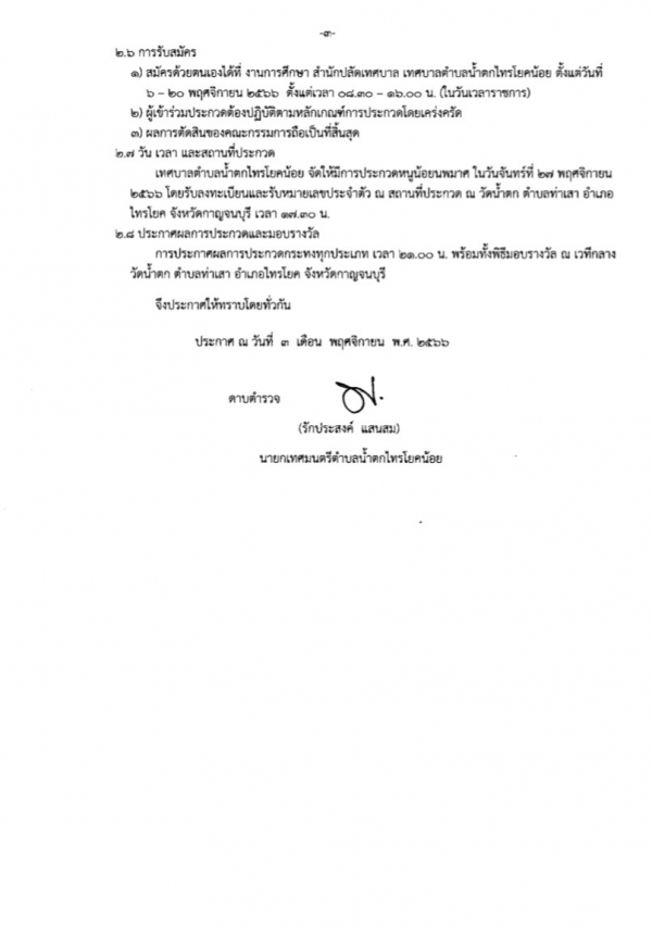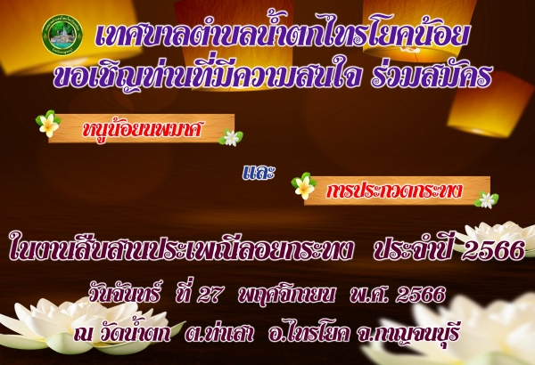 เทศบาลตำบลน้ำตกไทรโยคน้อย ได้กำหนดจัดงานโครงการสืบสานประเพณีลอยกระทง ประจำปี 2566 ในวันจันทร์ ที่ 27 พศจิกายน 2566 ณ วัดน้ำตก เพื่อส่งเสริมการมีส่วนร่วมในการอนุรักษ์สืบสานประเพณีวัฒนธรรมของไทยให้คงอยู่ จึงขอเชิญชวนผู้ที่สนใจ ร่วม...