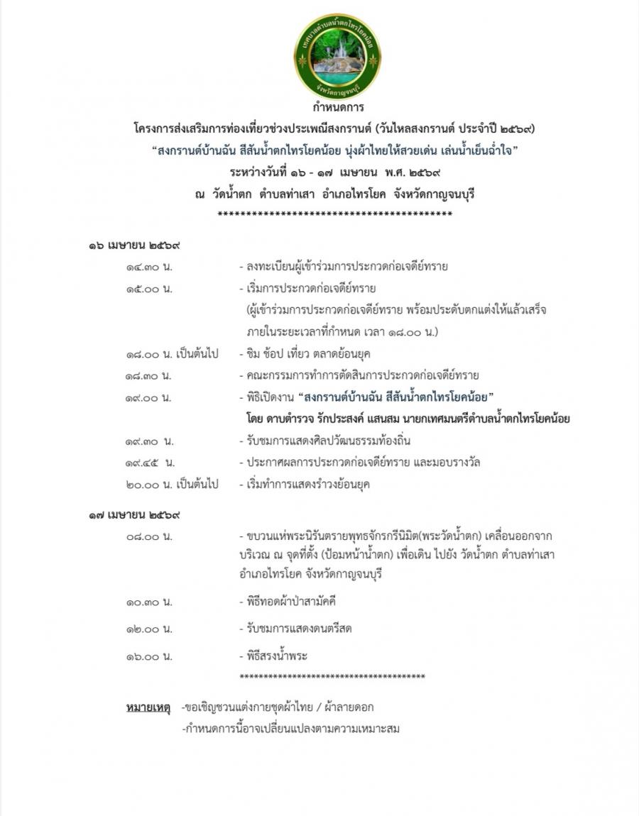 วันที่ 16 – 17 เมษายน 2569 ณ ลานวัดน้ำตก ตำบลท่าเสา อำเภอไทรโยค จังหวัดกาญจนบุรี