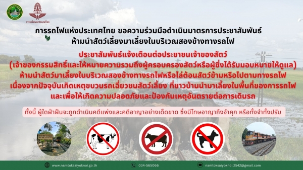การรถไฟแห่งประเทศไทย ขอความร่วมมือดำเนินมาตรการประชาสัมพันธ์ห้ามนำสัตว์มาเลี้ยงในบริเวณสองข้างทางรถไฟ