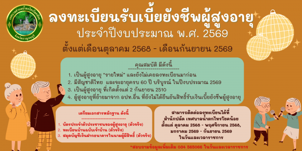 เปิดรับลงทะเบียนรับเงินเบี้ยยังชีพผู้สูงอายุ ประจำปีงบประมาณ 2569